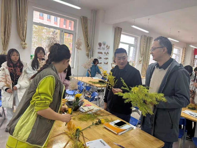 活动中,赵倩老师结合专业知识,示范直立式、倾斜式花型的构图技巧与剪枝要点。党员教师热情高涨,在赵老师一对一指导下,选取玫瑰、桔梗、尤加利等花材,将对传统文化的理解融入作品创作。现场花香萦绕,氛围轻松融洽。