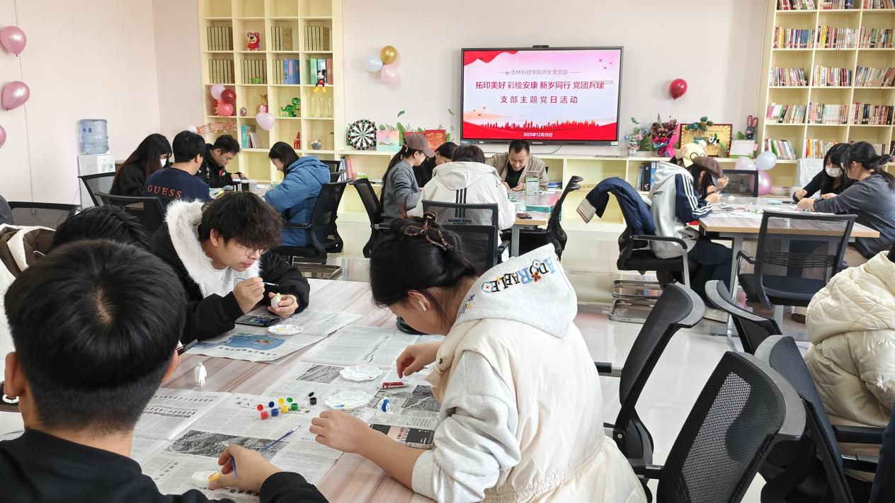 为迎接2026年元旦,深入学习贯彻党的二十届四中全会精神,强化党团共建与思想引领,丰富校园文化生活,农林科技学院师生党支部于2025年12月25日上午11:30在教学楼四楼心理活动中心,成功举办“拓印美好,彩绘安康,新岁同行党团共建”元旦主题活动。